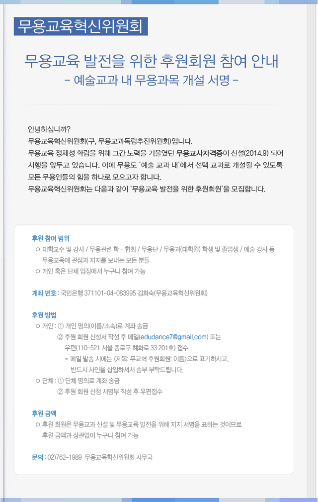 무용교육혁신위원회, 무용교육 발전을 위한 후원회원 참여 안내