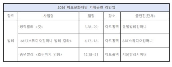 춤 부문으로 3월 28~29일 마포마트센터에서 작년 전국투어 공연 전 회차 전석 매진을 기록했던 윤별발레컴퍼니의 창작발레 〈갓〉, 4월 17~18일 한국인 최초 2025 로잔 발레 콩쿠르 우승자 발레리노 박윤재가 출연하는 〈ABT 스튜디오 컴퍼니 발레 갈라〉가 공연된다. 그리고 12월 18~21일 서울발레시어터가 송년발레 〈호두까기 인형〉을 공연한다.