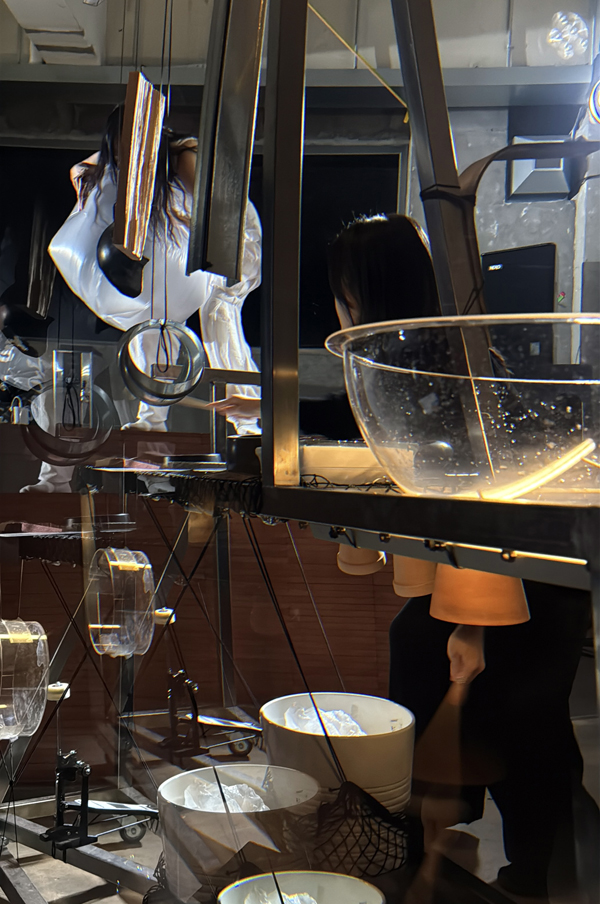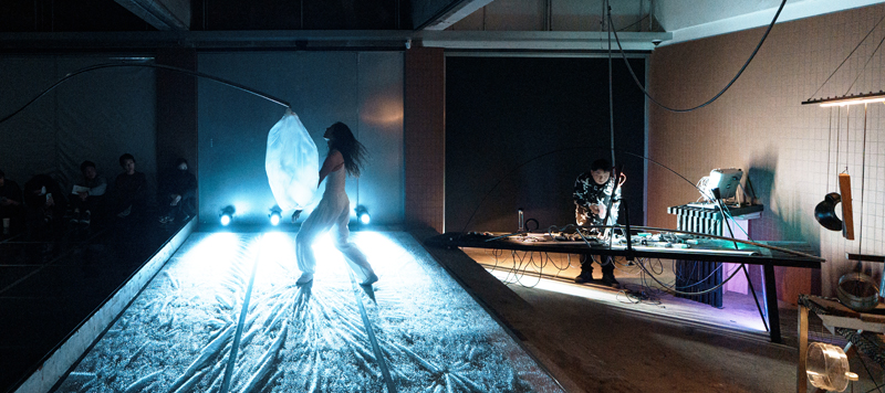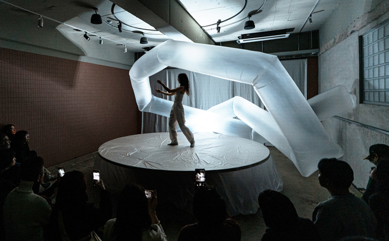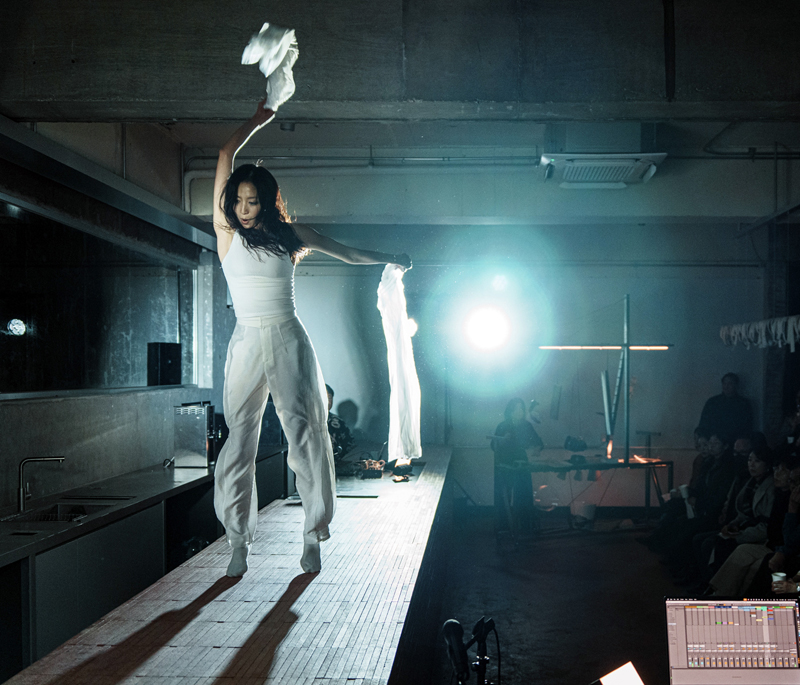 주변의 구조물을 응용하는 퍼포머는 싱크대를 악기처럼 두들기기도 하고, 데스크 가장자리에서 줄타기를 하며 일상의 사물과 직관적으로 만난다. 이내 부풀어진 비닐 풍선으로 관객과 교감하다 두번째 공간으로 이동하여 미리 설치한 구부러진 철제 가장자리에 메달아 놓는다. 사람만이 아니라 무생물과도 교감하는 순간, 장치는 그럴듯한 전시물로 격상된다. 바닥에 깔린 에어캡을 사뿐히 밟을 때 나는 소리와 그 틈새 공기와 앰비언트 사운드가 결합해 특별한 공간으로 탈바꿈되는 것이다. 물건을 포장하는 대수롭지 않는 것과 버려진 철제물이 퍼포머와 관계를 통해 그 가치가 재발견된다.