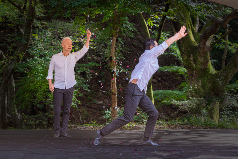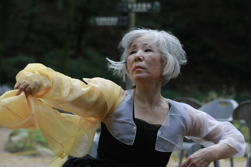 10월 18일과 19일 동학사 일주문 앞에서 박수정의 캘리퍼모먼스와 강은주의 〈巫· 舞· 無〉가 오프닝을 열었다. 이어 제임스 전과 정운식의 〈두 길〉, 남정호의 〈2025 가을 계룡산〉, 문진수의 〈벽사〉, 엄정자의 〈순환Ι〉이 선보였다. 해외 초청작으로는 인도 Rakesh, Priya Srinivasan의 전통춤인 〈사마간Smagan〉과 일반 부토를 배경으로 창작한 Okuyama Barabbas의 〈흘러가네Na ga re ta ri〉 순으로 이어졌다. 스트라빈스키의 ‘봄의 제전’곡에 강은주의 솔로춤과 박수정의 캘리퍼포먼스 협업으로 완성된 ‘무이무상無二無常’ 글귀가 적힌 흰 천이 동학사 터줏대감 격인 큰 나무에 안착하며 공연은 시작한다. 백발의 제임스전과 정운식은 여행가방을 들고 등장한다. 마치 인생 여정을 여행자의 시선으로 해석하는 것이지 싶다. 특히 사랑에 대한 기억들의 잔상을 쓸쓸하고도 아름답게 묘사했다. 계곡물소리와 바람에 흩날리는 나뭇잎이 자연스럽게 오브제가 되어 계절의 운취까지 더해졌다. 남정호는 특유의 밝은 표정과 공감능력으로 관객의 호응을 이끌어 내었다. 관객에게 자신의 나이만큼 회전할 것을 알리며 72번의 구호와 함께 턴을 돈다. 72년을 함께한 춤 인생이 축약된 회전으로 그 어떤 화려한 움직임보다 찰나적인 시간을 되돌아보게 했다. 젊었을 때의 분노와 열정을 뒤로하고 현재 이 순간을 즐기자는 ‘Don’t worry, Be happy’ 곡에 관객은 동조했다.