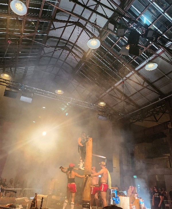 제이미 제임스의 퀴어 조명이 직접적인 반면, 포니 익스프레스의 〈The Queer Woodchop〉은 스포츠 경기와 쇼를 관람하듯 유머러스 하게 구성했다. 주최 측(퍼포먼스 스페이스)이 진행하는 퀴어 워크숍을 통해 완성된 작업으로 스릴, 경쟁, 유머, 통쾌함 같은 감정을 공연 방법론으로 환원해 내었다. 호주의 전통적인 스포츠 대회(Woodchop competition)를 무대화하고 나무를 자르는 행위에 남녀구분 없이 참여시키며(원래는 남자만 참여) 젠더 이분법을 해체하려는 의도로 보였다. 무겁지 않게 젠더이슈를 생각하게 하며 관객과 즐겁게 즐길 수 있었다. 스포츠 경기형식에 스펙터클한 볼거리를 제공하며 퀴어 커뮤니티와 자본주의 관계를 우회적으로 비판(pink capitalism)하는 흥미로운 공연이었다. 많은 공연을 봐왔지만 이러한 조합은 처음이라 신선하게 다가왔다.