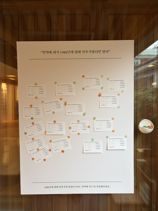 또한 관람객이 전시를 능동적으로 구성하고 해석하면서 관람하도록 연출했기에 마지막에 이를 성찰할 수 있는 코너를 마련했다. 만약 내가 당시에 안무가였다면 어땠을까? 이런 상상을 마음껏 해보는 것이다. 이를 통해 납작해졌던 작품들에 생기를 불어넣고 유산이라는 무게감에 짓눌리지 않으며 80년대 작품들과 관계 맺길 바랐다.