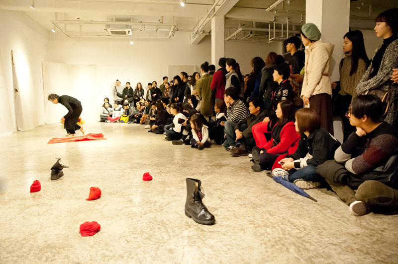 권옥희: 작가 본인의 의견을 듣고 싶었어요. 저는 어떻게 이해했냐면 이성의 폭력으로부터 해방되는 것, 언어로 설득하는 게 아니고 몸으로 하는 놀이로서 보여주려고 한 것이 아닌가. 전혀 다른 경험의 춤이 발전해서 춤으로 설득을 하는 것이 아니고 놀이의 차원으로 넘어간 것이 아니었나 싶습니다. 혹은 무녀들의 공수이거나. 선생님의 작품은 상당히 철학적이에요. 비합리성을 가지고 춤을 추는데 이게 원천적으로 동양에서 연유한 사고이고, 철학의 배경이고, 그런 것이 아나겠는가.