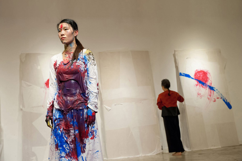 박은화: 그다음 작품은 〈그림자〉로 튜닝 13번째이고, 2015년도 것입니다. 부산의 창작공간 P라는 미술관에 초대받은 작품입니다. (바닥에 빨간색 동그라미가 크게 놓여 있다) 미술관 천장이 뻥 뚫린 채로 있었는데, 거기에 그림자를 조명으로 사용했어요. 부정적인 생각들이 나의 삶의 자원이 되어서 전환할 수 있다는 주제입니다. 제 개인적 shadow도 나오지만, 민족적 shadow도 나오고 또 댄서들 하나하나에게서 나오는 shadow가 있어요. 그래서 댄서들이 그림도 그리고, 춤도 추고, 노래도 하고... 댄서들이 한지에 그림을 그리고, 또 그걸 갖고 춤을 추기도 했습니다. 타말파에서 하는 자화상 같은 그림들이 무대에 전시되고 그걸 갖고 관객들 사이에서 불쑥불쑥 춤을 추기도 하고 관객들이 무대를 만들어주었습니다. 제가 꽁지 머리를 하고 다닐 때 출연한 공연이지요. 댄서 세 사람이 저렇게 벽에다 빨간색 점을 크게 찍어놓으면 제가 벽 전체에다 다른 물감으로 산을, 바다를 그리지요. 이틀 동안 공연 때마다 벽에 한지를 새로 입혔습니다. 창하는 사람이 반주했지요. 우리에게서 드러나는 그림자는 또 다른 뭔가가 들어오면서 긍정적인, 새로운 자원으로 가져갈 수 있다 하는 그런 퍼포먼스였습니다.