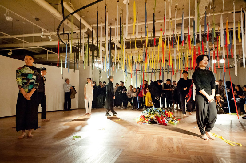 박은화: 그 다음 작품은 튜닝 15번 〈Soma〉(몸)입니다. 2017년도 것입니다. 수제천 음악을 갖고 만들었습니다. 오방색 한지들을 천장에 주렁주렁 매달고 한지 위에 종이 달렸지요. 그래서 무용수들이 스치기만 해도 방울 소리가 났어요. 우리 움직임이라는 것은 삶이라는 것, 그 안의 호흡과 맥박의 리듬을 탈 때 우리는 우리가 보지 못하는 바람이 날리는 현상을 보게 될 것이고, 소리를 만날 것이라는 취지로 ‘몸’을 주제로 다룹니다. 작년 연말 다른 미술관에 초대받아 협찬금을 받아 명확한 작가로서 전시했습니다. 올해는 연극에도 이 설치를 활용해서 제가 안무로 도움을 주었지요. 교육용으로 어린 아이들이 춤을 출 수 있게끔 하고, 떨어지는 종이가 있다면 거기에 자신의 소원을 적기도 하고. 시간이 지나면 어떻게 변하는지 실험하기도 했어요. 댄서들마다 자신의 에너지, 공간에서 만나는 것들을 작업을 통해 풀어냈습니다. 마지막에는 한지를 가위로 다 자릅니다. 흔적이나 기억들을 다 자른다는 것이지요. 그 아래서 춤이 지속됩니다.