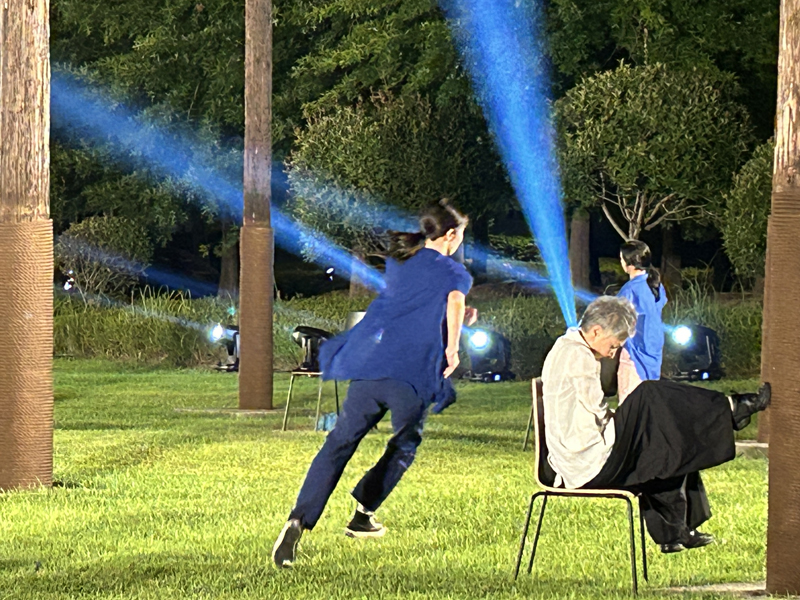 채희완: 이정희 선생의 큰 스케일과 열린 공간이 나에게도 영향을 미쳤다 하셨지요. 제가 봤던 이정희 선생의 작품 성향은 상황에 대한 사람들의 느낌과 반응을 포착하는 춤이어서 보는 사람들이 자기 동일시되는, 극적인 상황 속에 동참하는, 그래서 아주 와닿고 잘 느껴지는 춤이었던 것 같아요. 많은 부분 박 선생님의 성향은 관찰자적 입장에서 일정한 거리감을 두어서 하는 예가 많기 때문에 제가 방금 말한 같이 걷고자 하는 마음을 불러일으키게 하는 것 하고는 조금 다른 스타일인 듯합니다. 의도적으로 채택된 소리와 빛깔과 사물이 생동감을 던져 주는 리듬성이라고 해야 할지 생명 율동감이라 해야 할지, 동양에서는 기(氣)라고 하는데 그것이 무대 현장에서 강렬했을 때는 관중이 관찰 자리에만 있기 어렵지요. 말하자면 감정이입이나 참여 동기가 격렬해지기도 합니다.다만 기에는 색감이나 감각적 요소 같은 것이 빠져있기 때문에 기로만 얘기하기는 어렵고, 박 선생님 작품에서는 기의 율동이라고만 얘기하기에는 약간 섭섭한 점들이 있거든요. 입체감 또는 색채감 또는 소리의 질감 등등의 인간의 오감이나 육감들이 기의 움직임과 같이 있을 때 아주 강렬해지는데, 관찰자적 의도가 강렬할 때에는 결과적 반응이 덜 와닿았다고 제가 스스로 판단하기도 하는 거죠. 이게 선생님의 의도에 맞는 얘기인지 잘 모르겠습니다.