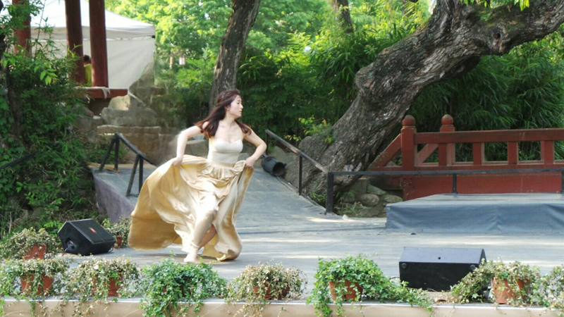 좌우로 대나무 숲이, 정면으로 소나무들이 듬성듬성 보이는 둔덕, 그 뒤로 보이는 흰 구름과 어우러진 푸른 하늘은 그 자체로 한 폭의 그림이었다. 무용수들의 완급을 조절하는 움직임과 대숲 사이로 울려 퍼지는 소프라노의 감미로운 음악이 더해지면서 숲과 하늘도 함께 춤추기 시작했다.