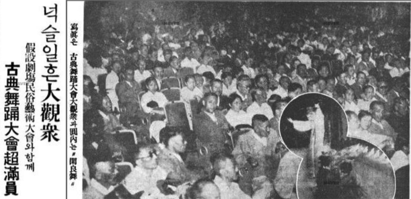 도판 3.「조선고전무용대회」광고글(좌)과 공연현장(우). 동그라미 안 사진은 한량무(「Joseon Classical Dance Event」Advertisement(Left) and Performance Venue(Right). The Picture of Hallyangmu Inside the Circle) |