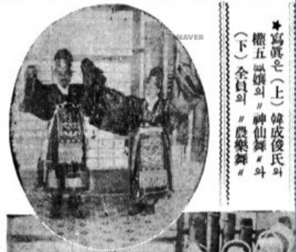 도판 4. 신선무 복장을 입었다고 소개되는 한성준과 권오봉(Han sung-jun and Kwon Oh-bong Introduced in the Attire of Sinseonmu). “사진은 상(上) 한성준씨와 권오봉양의 신선무와 하(下) 전원의 농악무” 1940. |