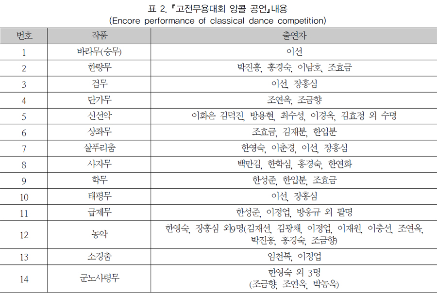 이러한 문제점이 있었음에도 무용대회는 대중의 엄청난 호응을 받았고, 이에 힘입어 1938년 6월 23일 「고전무용대회 앙콜 공연」이 다시 열리게 되었다. 공연된 작품은 〈표 2〉와 같다. 이 날의 공연의 특징은 현대적 감각이 더하여진 민속무용으로, 무대효과를 위해 동작을 전폭적으로 확대하여 바라춤과 검무 등에 있어 그 특징이 두드러졌음이 기사에서 확인된다(“문화유산의 재음미 전아한 선율의 입체화 동중정의 무아경지” 1938). 또한 이번 공연에서 농악과 군노사령무가 처음 소개되었다.(“현황 찬란한 무아경 고전무용대회 수재현” 1938).