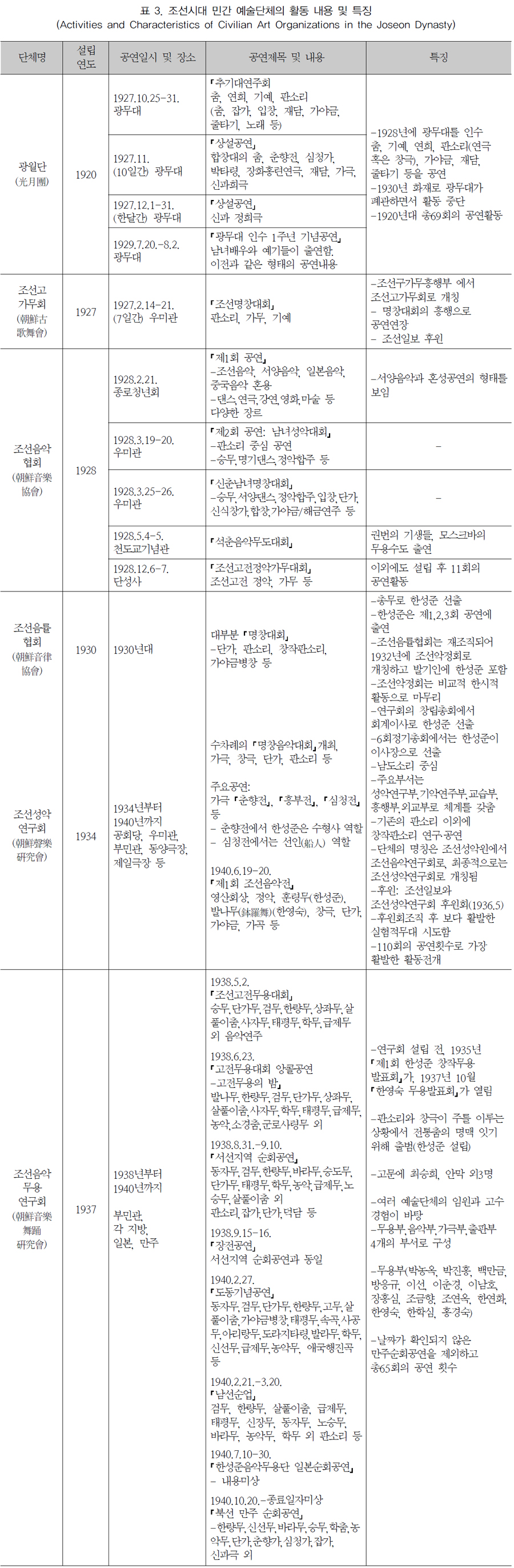 1940년 10월의 만주 공연을 마지막으로 조선음악무용연구회의 활동은 더 이상 볼 수 없다. 1941년 9월 한성준의 죽음 이후 연구회의 활동도 중단되었다. 이제까지 살펴본 광월단, 조선고가무회, 조선음악협회, 조선음률협회, 조선성악연구회, 조선가무연구회, 조선음악무용연구회의 주요활동과 그 특징을 정리하면 〈표 3〉과 같다.