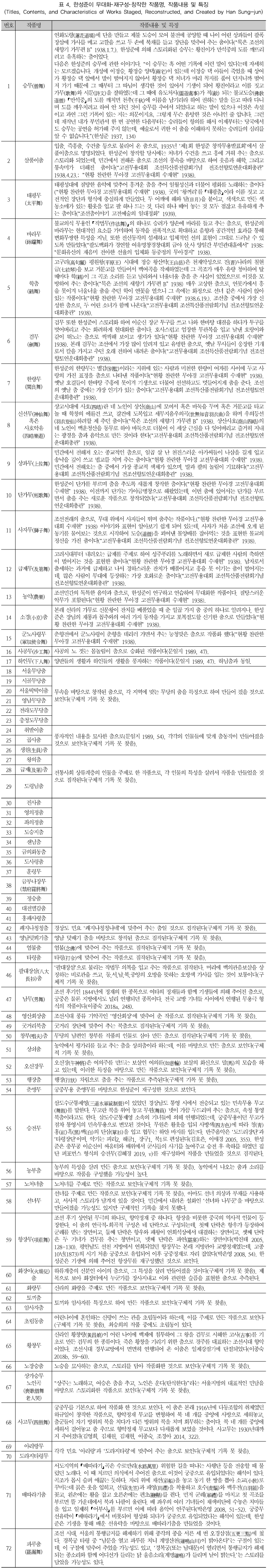 한성준이 창작한 작품의 수는 100여종이라 알려지는데(“지원자엔 무제한교수 기관지발행계획” 1938), 1차 신문자료, 무용사 서적 및 논문을 확인한 결과 그가 무대화‧재구성‧창작한 작품은 약 72개로 정리되었다. 한성준의 작품에 대한 『조선일보』기사, 단행본(문일지 1989; 오화진, 1992; 김영희, 김채원, 김채현, 이종숙, 조경아, 2014), 그리고 기타 출간물(이병옥, 2019)을 참조하여 정리하였다. 그 작품명과 특징은 〈표 4〉와 같다. 여기에서 정리된 작품 중 「학춤」, 「하인춤」, 「팔대장삼춤」, 「상가승무노인곡」, 「파루춤」에 대해서 윤중강 공연평론가의 수정·보완 의견을 반영했다.