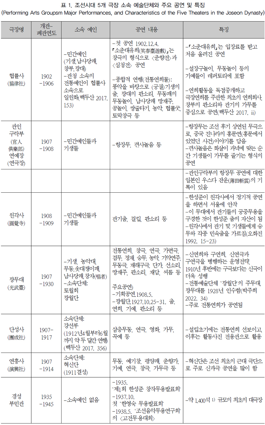 이러한 극장업자들의 조력으로 전통연희는 대중들에게 지속적인 관심을 받을 수 있는 힘을 얻었다. 대부분의 극장에 소속된 예인집단이 존재하였는데, 주로 창부(唱夫)와 악사로 구성된 남성 예인들은 극장 소속이거나 이름을 내건 단체를 조직하면서 ‘-일행’ ‘-협률사’의 이름으로 활동했다. 이들은 서울을 중심으로 주기적인 지방순회공연을 통해 서울춤을 대중들에게 소개하고 전파했다(백두산 2017, 354). 1900년대부터 1940년대 사이의 춤과 관련된 주요 극장이었던 협률사, 광무대, 단성사, 연흥사, 경성부민관 등 서울에 위치한 5개 극장의 소속 예술단체와 주요 공연 및 특징은 <표 1>과 같다.