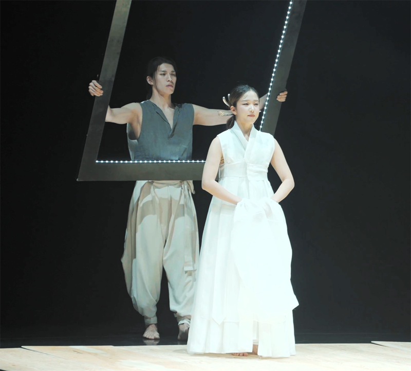 전반부 전체에서 사람 키 높이의 얇은 널판지는 소품으로서 그 역할이 컸다. 출연진들은 널판지를 한 장씩 들고 등장하여 커다란 바람개비처럼 공중에서 돌리거나 바닥에 여러 가지 포맷으로 배열한다. 널판지들로 무대 위에 사각형의 빈 공간이 조성되면 그 속에서 사람들은 춤으로 놀아간다. 또 그것들은 가야금 같은 가상의 악기가 되다가 징검다리가 된다. 그리고 몇 장이 모이면 화문석이 되어 춘앵전을 추는 춤판이 된다. 돌려지는 널판지가 시간의 흐름도 암시할 테지만, 그것은 그 안에서 그 위에서 춤추는 공간이 되고 악기가 되고 사람들의 만남을 잇는 징검다리가 됨으로써 널판지에서 생성되는 시간들이 환기하는 느낌은 상큼하다. 또 하나의 소품으로서, 대형 거울 크기의 나무틀은 그것을 통과하는 사람이 어떤 환상의 세계로 진입하는 입구가 되고 바닥에 놓인 그 틀 안에서 춤추면 환상의 춤판이 된다.