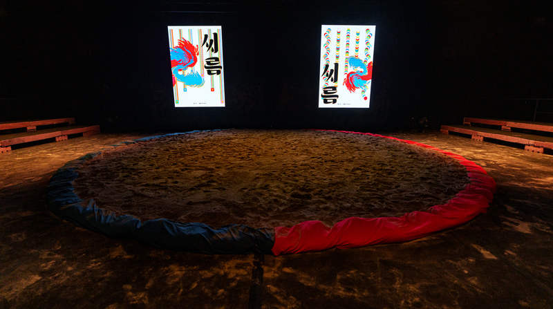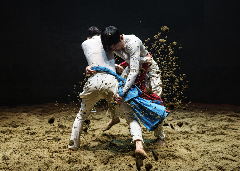 공연 〈씨름〉에서 가장 압도적인 재연은 씨름판을 그대로 옮겨 놓은 듯한 모래 씨름판이 무대로 설정된 중앙에 놓여 있는 것이었다. 메리홀의 객석은 사라졌다. 그리고 나무로 된 단 위에 의자를 놓고 객석을 3면에 만들었고 그 가운데 모래주머니와 원형의 벽을 쌓은 모래판이 있었다. 피나가 〈봄의 제전〉에서 무대 위에 진흙을 다져 깔고 그 위에서 뒹굴며 춤을 춘 것, 카네이션을 무대가 좁도록 깔아 꽃밭을 만들고 그것을 짓이기거나, 낮게 물을 채워 물 속에서 춤을 춘 것 등 무대를 플로어가 아닌 다른 물질로 채워 다른 공간으로 변신시킨 것처럼, 〈씨름〉의 무대는 충실한 다큐의 방식만큼이나 공연이라는 가상과의 긴장을 창출했고 안무가와 출연자들은 그 긴장의 칼 위에서 끝까지 고투했다.