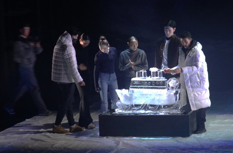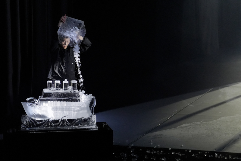 얼음을 흩뜨린 출연자가 얼음을 다시 주워담는 사이 객석의 집단은 무대로 돌아가서 같은 동작들로 무리를 짓는다. 얼음 큐브를 주워담은 투명 박스를 마임이스트가 객석으로 갖고 내려와서 멍하니 살펴보고 객석을 응시할 동안 무대 위의 집단은 사라진다. 어두워진 무대에서 하얀 패딩을 걸친 어느 출연자가 빗살 구조물 앞을 뚜벅뚜벅 통과하고 나자 빙산이 무너지는 굉음이 계속 들리고 크루즈 유람선, 빗살 구조물, 대형 고드름, 낙하하는 물방울로 생성되는 둥근 파동 이미지만 남은 상태다. 얼음 박스를 들고 무대로 되돌아간 마임이스트가 박스를 치켜들고 크루즈 유람선을 향해 얼음 큐브들을 쏟아붓는 것과 동시에 빗살 구조물에서 엄청 강렬한 빛이 뿜어져 나오고 대형 고드름은 바닥까지 하강하며 바닥에는 빙하-빙판의 파열을 나타내는 찢어진 이미지가 투사되는 대파국이 빚어진 상황에서 무대는 여전히 기후위기를 남긴 채 마감한다.