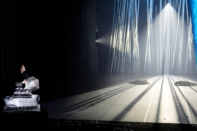 상체만 하얀 패딩을 걸친 집단이 등장하여 카메라맨과 서로 촬영에 몰두하는 도중 무대는 어느덧 붉은 조명으로 물들고 허공에 붉은 레이저빔이 나타난다. 여기에 잔잔하며 빠른 금속성 굉음(이 굉음은 〈멜팅〉의 주제곡인 듯이 여러 차례 길게 들렸다)이 최면제처럼 지속적으로 반복되는 것은 그런 촬영 행동이 중독 증세에 빠졌음을 느끼게 하며 또 그들이 촬영-관광에 몰두하는 사이에 기후위기는 깊어만 간다. 이 대목은 또한 오늘날의 샷 강박 세태도 연상시킨다. 한참 후 무대 정면에서는 빗살이 촘촘히 박힌 금속성 수직 구조물이 모습을 드러내며 대형 고드름 같은 기다랗고 예리한 3각형 물체가 바닥을 향해 천장에 매달리고 물안개가 자욱한 가운데 빙하 같은 그 무엇이 내려앉는 듯한 쿵쿵 소리가 울리며 빙하가 녹아 흐르는 물소리도 들린다.