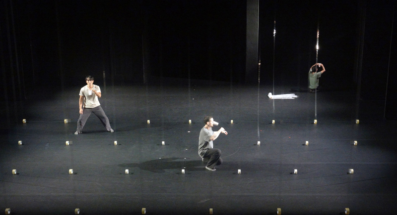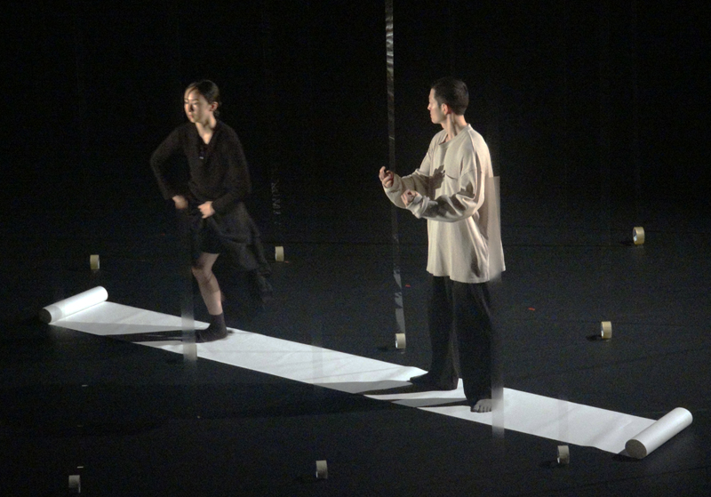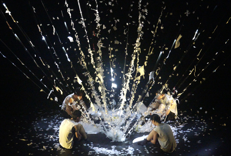 이어서 사람들이 숟가락들을 여기저기 테이프에 다시 달면서 티슈 휴지와 작은 소품도 붙인 후에 사람들이 각자 금속제 통을 들고 나와 소리를 내다가 무대 가운데에서 통을 하나씩 뒤집으니 얇은 습자지 류의 하얀 종이조각들이 쏟아진다. 수북이 쌓인 종이조각 둘레에 투명 테이프들을 대량으로 부착해서 두르고 또 천장에 늘어뜨린 테이프와도 연결시킨다. 그런 다음 종이조각 무더기 둘레에 앉아서들 부채를 부치기 시작하자 종이들이 마구 휘날려 테이프들 여기저기에 마치 포획되는 날벌레들처럼 붙여진다. 무대 뒤켠에 가라앉아 남겨졌던 얇은 그 비닐막을 종이 무더기 옆으로 가져와서 모두들 그 속으로 들어가 바닥을 기어가고 누운 채 종이 무더기 둘레를 회전하며 종이 무더기와 뒤엉키자 투명 테이프들의 아래 부분이 하나로 뭉쳐지고 마침내 전체 모양이 거꾸로 매단 원추 같은 테이프 형상이 눈앞에 나타난다. 그런 후 출연자들은 비닐막 허물을 벗듯이 퇴장하며, 남겨진 거꾸로 매단 원추 형상은 마치 흐드러지게 핀 하얀 쌀꽃처럼 다가온다.