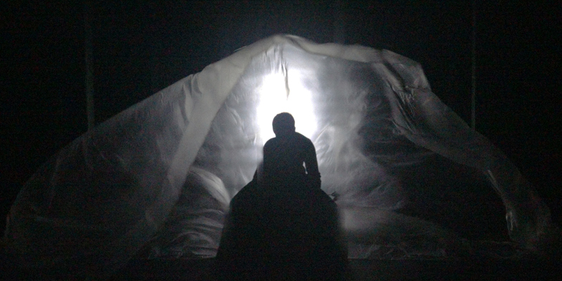 후반부에서 두 사람이 부채를 휘저으며 접고 펴며 갖고 놀며 한 사람이 얇은 투명 비닐을 바닥에 부착해놓으면 투명 비닐 양쪽에서 마주 앉아 열심히 부채질을 해대니 투명 비닐은 바닥에 부착된 상태에서 부풀어서 마치 투명 애드벌룬처럼 솟아 오른다. 부채질을 그치자 애드벌룬은 가라앉아 사그라지며, 한 사람이 다시 숟가락들을 테이프에 붙이고 퇴장한다. 부채질을 다시 하자 부풀어 오른 그 애드벌룬 속에서 어느 여성이 무당방울을 흔들며 소리를 내고 전신을 일렁이는 실루엣의 모습을 보인다. 물질 속에 어떤 영적 차원이 있다는 감을 던지는 대목이다.