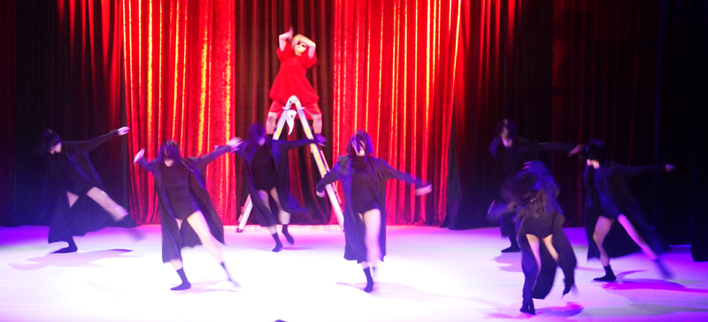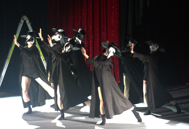 공연은 붉은 투피스에다 검정 양말, 까만 선글래스를 착용한 여자가 푸른색 형광 빛 대에서 사방을 휘젓다가 사라지면 검정 가운과 검정 의상, 검정 모자와 양말에다 기다란 부리 가면을 착용한 예닐곱명이 등장하여 집단적 움직임을 펼쳐낸다. 그들이 착용한 것은 이른바 흑사병 코스프레 코스튬이라는 것이며 중세의 공포와 죽음을 상징한다고 한다. 공연 초반부터 흑사병 코스프레 코스튬이 등장함으로써 지금 세상의 상황이 그처럼 암담하다는 것을 시사하는데, 안무자의 단도직입적인 문제의식이 읽히는 설정이다. 이어지는 장면들에서 젊은이들이 쓰러지고 일어나며 살려고 발버둥치는 갖가지 모습들이 상당히 빠르게 연속된다.