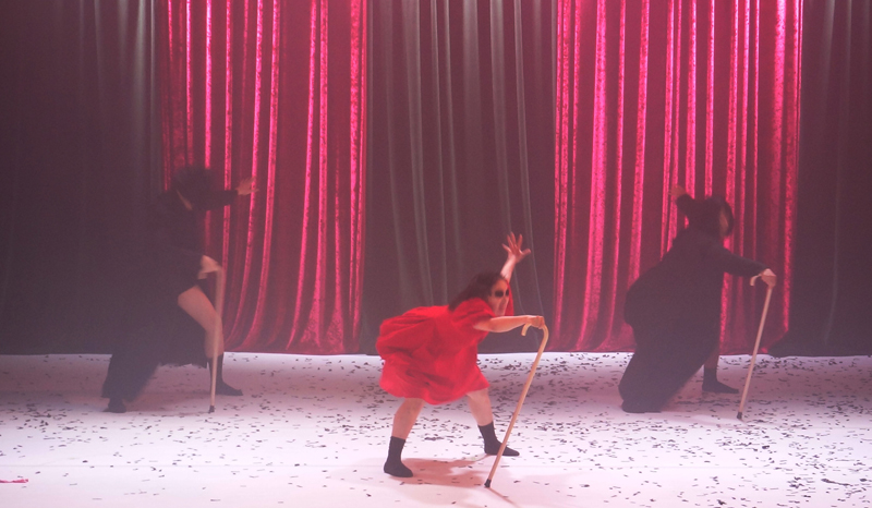 그 붉은 투피스의 여자는 잦은 등퇴장과 솔로 연기를 통해 출연자들을 채근하거나 다독이며 공연의 진행을 주관하는 역할을 하였다. 이 여자의 역할은 〈호두까기 인형〉의 마법사 드롯셀마이어의 것과 닮았다. 여자는 쓰러졌다 재기하는 사람들에 합류하여 그들과 하나가 되기도 하고 쓰러진 사람을 구조하고 사람들의 기를 돋우곤 한다. 사회의 관찰자로서 부산스럽게 등퇴장하는 그 여자는 드롯셀마이어에다 좀 과장된 연기가 말해주듯이 코믹한 성격이 더해진 인물로 설정되었다. 그 여자가 관찰 목격하는 사회에서는 사람들이 긴급히 구조되어야 하거나 소수 인원들끼리 결속하다가 자포자기에 이르고 다시 뭉치는 순간들이 이어진다. 〈호두까기 인형〉의 ‘꽃의 왈츠’ 곡은 〈황폐한 땅〉에서 사람들이 서로 위로하고 기운을 차려 안개가 자욱한 세상을 헤쳐나가도록 하는 분위기를 만든다. 그러는 사이에 무대 바닥으로 떨어져 내리는 검은 눈발은 여전히 암울한 메시지를 환기한다.
