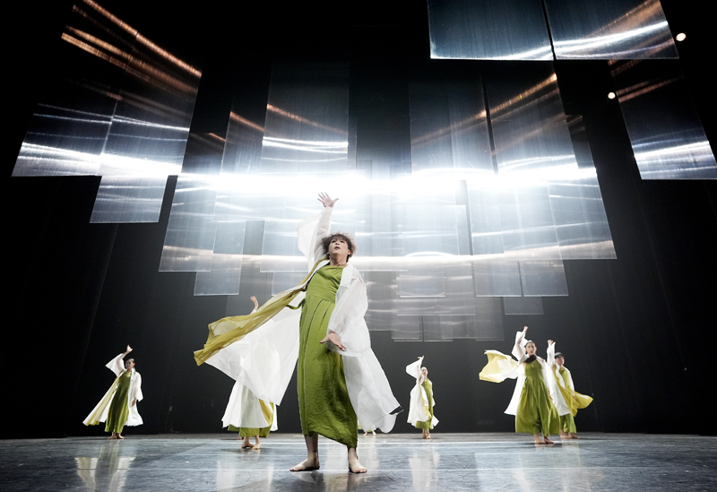 2장. 천장에 걸려있던 아크릴판이 앞뒤, 옆으로 엇갈리니 판마다 틈과 길이 생겨난다. 흰색 두루마기를 걸친 무용수들이 혼령처럼 그 사이를 서성이며 소리친다. 독립선언문의 내용을 읊고 있다. 뒤이어 허리를 앞으로 푹 꺾은 채 걸어나온 군무진이 무대를 가로지르며 춤을 춘다. 가운데로 모여들며 바닥을 흔들흔들 밟고 누르며 중앙에 모였다가 한꺼번에 휙 몸을 일으킨다. 지금은 꺾였지만 힘을 모아 나라를 되찾겠다는 춤. 작은 그룹으로 모여추는 군무, 팔을 꺾어 손을 맞잡고 원을 만들어 돌면서 추는 춤은 독립을 모색하는 것일지도. 춤에너지가 지난 해 보던 것과 달리 흩어져 보인다. 극장 공간이 달라진 것이 이유인지도. 겉옷을 벗어 땅을 치고, 살풀이 수건을 손에 들고 추는 것 같은 윤무. 살짝 옅어졌지만 의도가 잘 드러난 춤이었다.