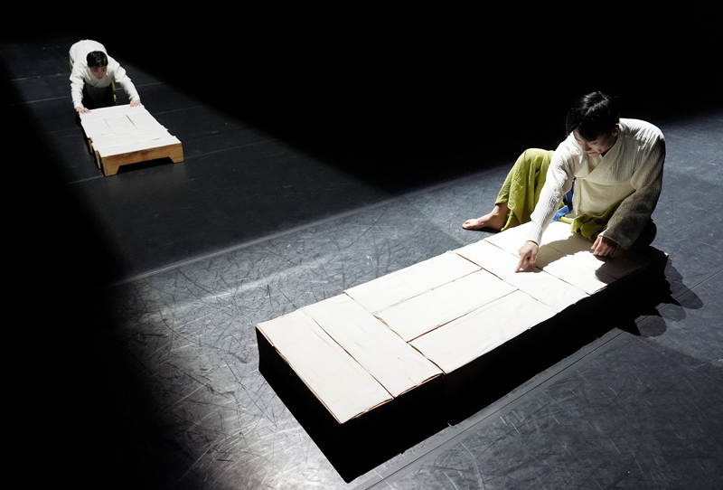 3장. 남자(김현태)가 다듬이 돌을 이어 붙여 밀고 들어온다, 느리게. 마치 관처럼 보이기도. 〈큰 강물이 비로소 길佶을 열었다〉 중에 가장 미감이 뛰어난 부분이다. 다듬이돌 위에 엎드린다. 무대 안쪽에서 깊숙한 곳에서 다른 남자(서상재)가 다듬이돌을 직각 방향으로 밀고 들어와 모서리를 맞춘뒤, 그 옆에 앉는다.