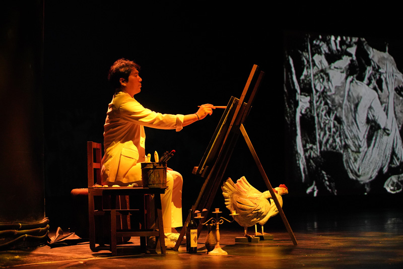 노랑색 원피스를 입은 여인이 무대로 들어오자 앉아 있던 화가가 여행 가방을 건넨다. 뱃고동소리에 여행을 떠나는가 짐작, 다시 의자와 테이블이 들어오자 포즈를 잡고 앉는다. ‘사랑-노란옷의 여인’ 씬으로 이인성의 작품 〈노란옷의 여인〉을 풀어내는 이야기다. 화가가 손가락을 구부려 구도를 잡고, 이리저리 자세를 고쳐주고 이젤앞에 앉자, 남자무용수 몇이 그녀를 들어올린다.
