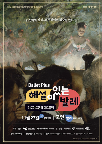마포문화재단(고영근 대표이사)은 11월 27일 마포아트센터 아트홀 맥에서 해설이 있는 발레 'Ballet PlusⅡ – 고전발레로의 초대'를 선보인다. 이번 공연은 발레 입문자부터 애호가까지 누구나 쉽게 즐길 수 있도록 해설을 곁들인 갈라 형식으로 구성된다.