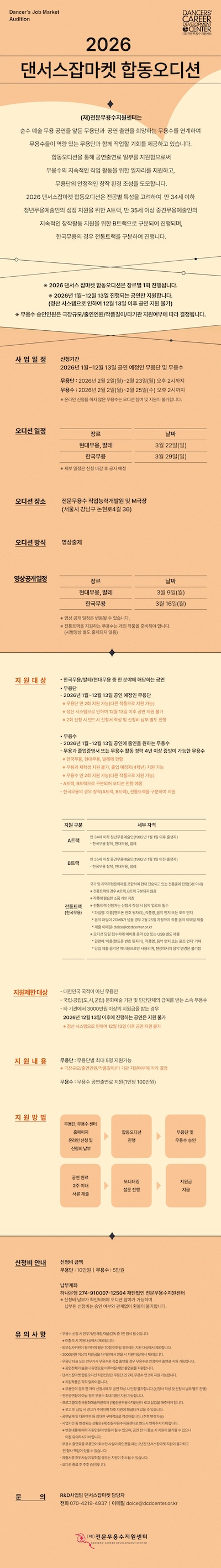 전문무용수지원센터는 2026년 1월부터 12월 13일 사이 공연을 예정한 무용단과 무용수를 대상으로 ‘2026 댄서스잡마켓 합동오디션’을 개최한다. 이번 오디션은 무용단과 무용수 간 직접 매칭을 통해 실질적인 취업 기회를 제공하는 프로그램으로 마련됐다.