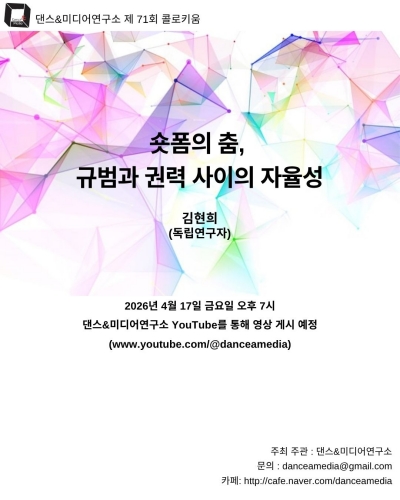 댄스&미디어연구소가 제71회 콜로키움을 4월 17일 개최하며, 댄스&미디어연구소 유튜브 채널을 통해 영상으로 공개할 예정이다. 주제는 ‘숏폼의 춤, 규범과 권력 사이의 자율성’이다.
