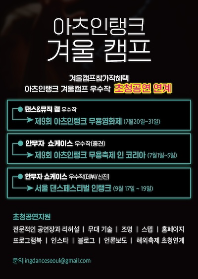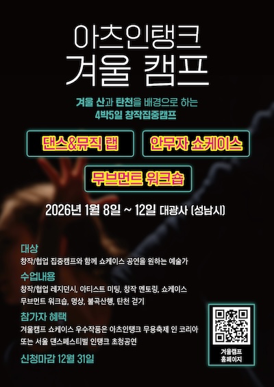 캠프 마지막 날에는 ‘무용 & 음악 랩’과 ‘안무자 쇼케이스’를 통해 완성된 작품을 발표하는 쇼케이스가 진행되며, 우수 참여자는 향후 진행될 아츠인탱크 무용축제 인 코리아 그리고 서울 댄스페스티벌 인탱크 초청공연으로 연계될 수 있는 기회를 얻게 된다. ‘2026 아츠인탱크 – 겨울캠프’는 4박 5일 일정으로 진행되며, 참가 신청은 12월 31일까지 공식 홈페이지에서 접수할 수 있다.