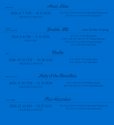 (재)국립발레단(단장 겸 예술감독 강수진)이 2026년 라인업을 발표했다. 2026년에는 클래식 발레의 정수 〈백조의 호수〉를 시작으로, 두 개의 현대 발레 작품을 하나의 무대에서 선보이는 〈더블 빌(Double Bill)〉, 낭만 발레 〈지젤〉, 드라마 발레의 거장 존 노이마이어의 〈카멜리아 레이디〉, 그리고 연말 스테디셀러 〈호두까기인형〉까지 다채로운 레퍼토리를 무대에 올린다. 또한 국립발레단의 창작 생태계를 확장해온 ‘안무가 육성 프로젝트’의 11번째 시리즈 〈KNB Movement Series 11〉 역시 새롭게 관객들을 찾아갈 예정이다.