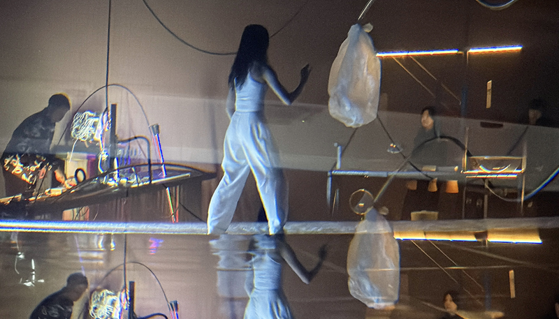주변의 구조물을 응용하는 퍼포머는 싱크대를 악기처럼 두들기기도 하고, 데스크 가장자리에서 줄타기를 하며 일상의 사물과 직관적으로 만난다. 이내 부풀어진 비닐 풍선으로 관객과 교감하다 두번째 공간으로 이동하여 미리 설치한 구부러진 철제 가장자리에 메달아 놓는다. 사람만이 아니라 무생물과도 교감하는 순간, 장치는 그럴듯한 전시물로 격상된다. 바닥에 깔린 에어캡을 사뿐히 밟을 때 나는 소리와 그 틈새 공기와 앰비언트 사운드가 결합해 특별한 공간으로 탈바꿈되는 것이다. 물건을 포장하는 대수롭지 않는 것과 버려진 철제물이 퍼포머와 관계를 통해 그 가치가 재발견된다.