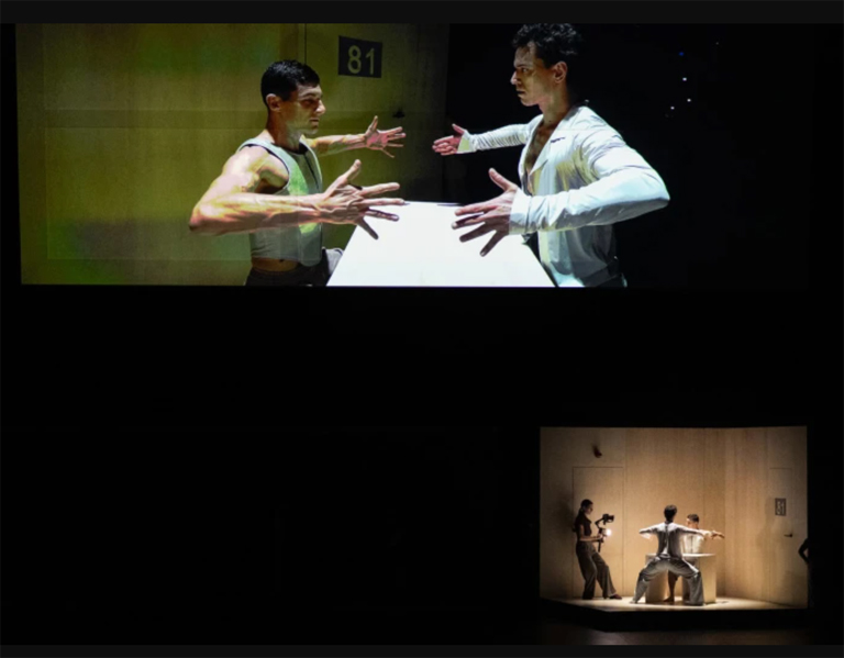 〈아레나〉는 40대 초반의 두 여성 안무자, 제시카 라이트(Jessica Wright) 모건 라너커-템플(Morgann Runacre-Temple)이 공동 안무하였다. 두 사람은 2022년에도 영국 버밍엄로열발레단을 위해 영상과 결합한 발레 〈호텔〉을 제작한 바 있다. 라이브 공연과 촬영된 영상이 어우러지는 〈아레나〉가 구체적으로 어떻게 전개되는지 먼저 뉴욕타임스를 보자. “파리오페라발레단 무용수들은 자기들 위 스크린에서 영상이 재생되면 자신의 차례를 기다리고 있었다. 스크린 속에서 한 남자가 몸을 빙빙 돌리고 숙이는 동안 하얀 천이 그의 몸 주위에서 어지럽게 휘몰아쳤다. 그러다 천이 사라지고 조명이 깜빡이더니 그는 스크린 밖으로 걸어 나와 파리오페라발레단의 리허설 공간으로 들어갔다. 그가 무대 위 무용수들과 합류할 동안 카메라맨이 촬영했고, 무용수들은 이제 역동적인 리듬에 맞춰 민첩하게 움직이기 시작했다.” 가디언의 소개는 이렇다. “이 작품은 절제된 타악기적 리듬과 〈코러스 라인〉을 연상시키는 분위기로 시작된다. 운동선수 집단이 개인적이며 집단적인 자신감을 갖고 몸을 풀기 시작한다. ‘다음!’이라는 내레이션이 울려 퍼지고, 줄지어 선 무용수들을 카메라맨이 뒤따라 움직이면서 번뜩이는 눈빛, 뛰는 가슴, 맺힌 땀방울을 포착한다.”