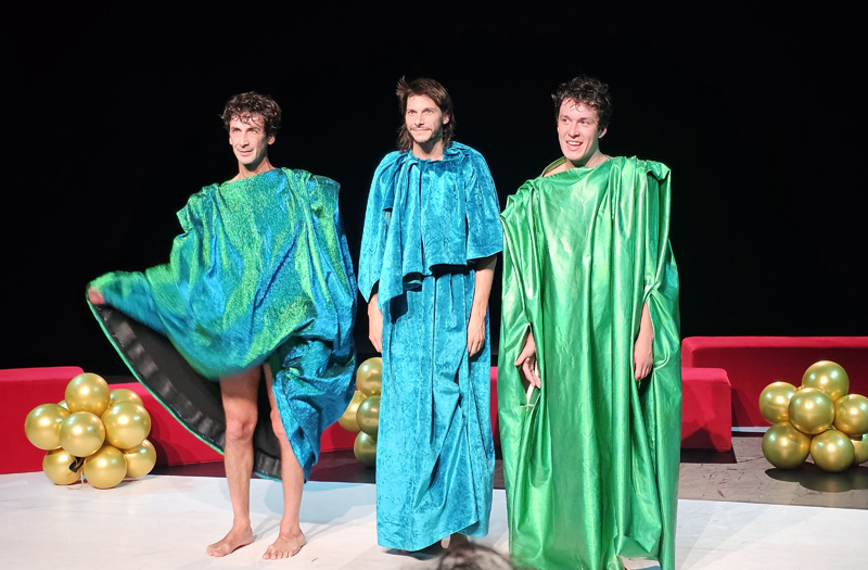 고개가 의자 뒤로 넘어가자 여러 방법으로 꼬는 다리만 한동안 보였다. 의자에 앉아서 시선은 계속 앞을 향하고 아주 불편한 표정을 하며 형태를 만들더니 바닥으로 떨어졌다. 바닥에서 물고기처럼 퍼덕거리는 등 몇 가지 행위를 하다 셋이 삼각형으로 발을 붙이고 다리만 움직였다. 음악이 강해지고, 조명도 어두워지자, 끽끽 소리를 한 명씩 내더니, 천에 풍선이 여러 개 달린 옷을 입고 나타나 움직이다 끝났다. 춤은 없고 아이디어만 있었던 공연으로 유럽에서 자주 보이는 작품 스타일이다. 비록 춤이 없어도 감동을 주는 많은 작품에 비해 이해하기 어려운 작업이었다.