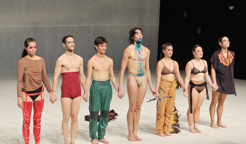 남녀가 한 손에 긴 손가락이 달린 장갑을 끼고 듀엣을 추었다. 부드럽고 유연한 듀엣으로 나무 잎사귀들의 사랑이었다. 피쉬라는 글이 나오고 상수에 조명이 한 줄로 가늘게 비추자 무용수들의 팔과 손가락이 보였다 사라졌다 했다. 마치 생선들이 움직이듯. 이어 위에서 내려온 사각 조명 아래 남자가 반나체로 무대 중앙에서 양다리를 벌리고 앉아 개구리처럼 춤을 추었다. 토끼 가면을 쓴 여자가 양옆에서 귀엽게 몸짓을 했고, 슈트 입은 남자가 말을 하며 춤추었다. 공룡 뼈들이 바닥에 있었고, 다섯 무용수가 이 뼈들을 붙이자 공룡이 살아 움직였다. 원시림의 모습이라고나 할까. 걷던 공룡이 앉았다가 드러누웠다. 마치 죽은 것처럼. 다섯 무용수가 죽음을 지켜보았다. 상수에서 여러 무용수가 등장하고 인도음악 비슷한 아리아가 나왔다.