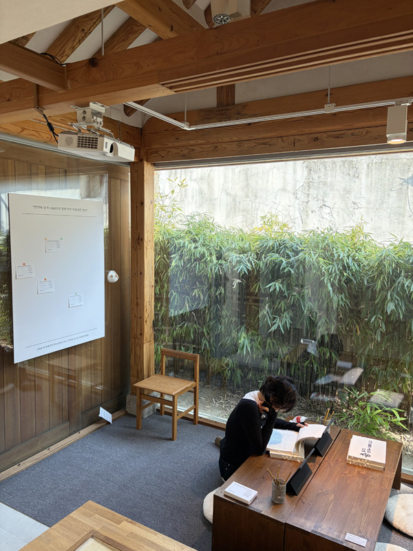 원래 마당이었던 낮은 공간에는 카펫을 깔고 책상을 두어 관람객이 여유 있게 전시를 음미하도록 꾸몄다. 벽에는 엽서를 작성해 붙이는 참여공간을, 책상에는 전시에 활용된 1차 자료물을 직접 살펴볼 수 있는 ‘깊게 읽기, 깊게 보기’ 코너를 마련했다.