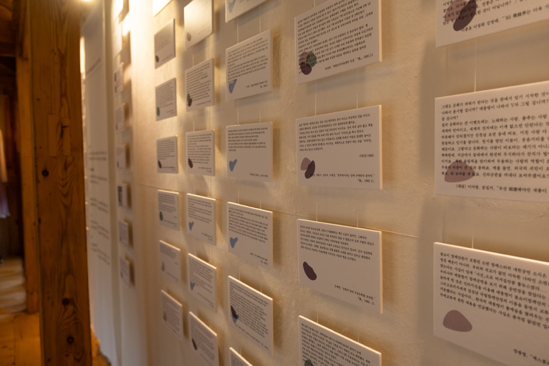 주요 연표를 정리한 자료들이 처마를 따라 천장에서 길게 늘어뜨려져 있는 다섯 개의 족자에 담겨져 있는 것도 이색적이다. 좁은 공간을 활용하기 위한 아이디어를 넘어 천으로 제작된 특별한 질감이 느껴져 공들인 흔적을 읽을 수 있었다.