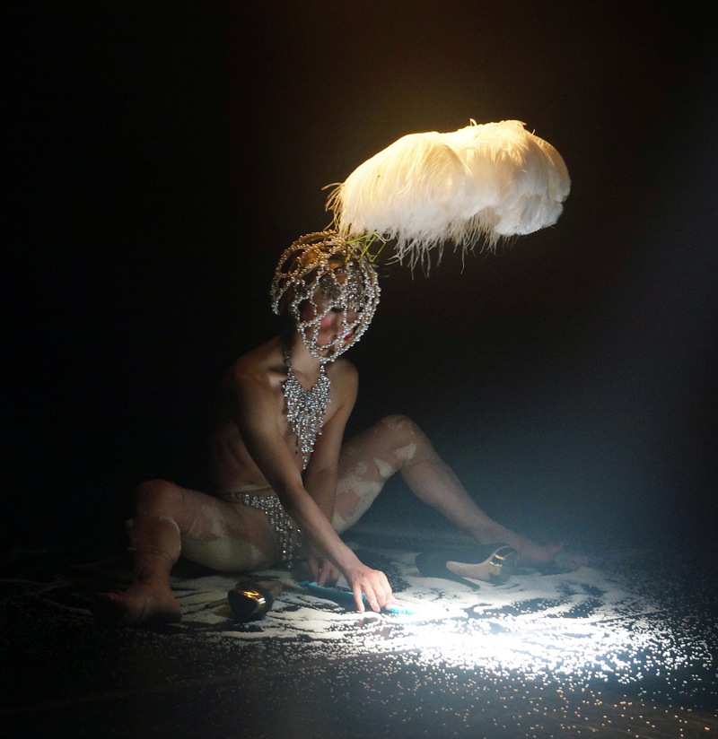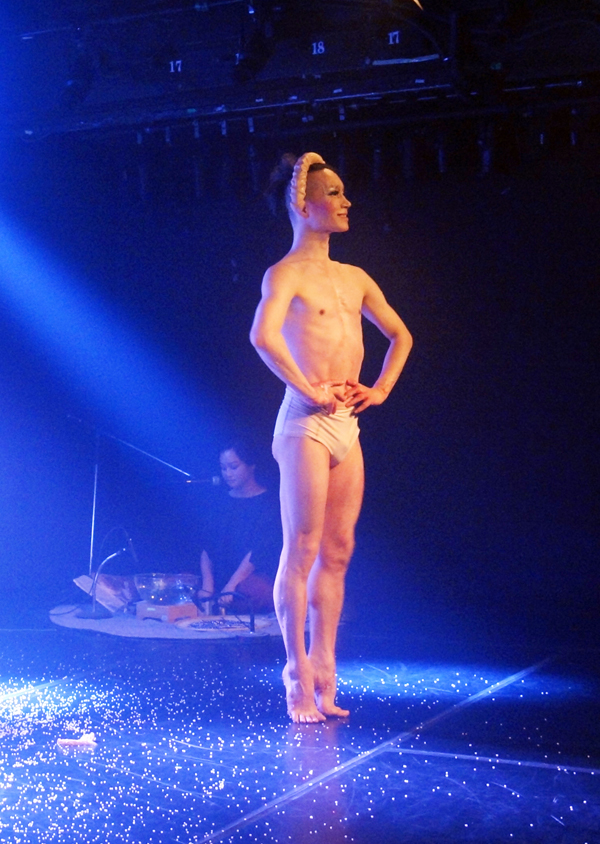 남자의 몸으로 태어났으나 자신이 여성임을 의심해본 적이 없다는 모지민은 트랜스젠더라 여겨지는 듯하다. 하지만 그는 성전환 수술을 택하지 않았고, 이번 무대에서는 그의 태어난 남자의 몸이 노출되곤 하였다. 어느 부분에서는 팬티를 착용한 상태에서 가위를 들고서는 남성 성기 모형을 자신의 성기 부분에 갖다 대며 관객에게 자르라고 청하는 코믹한 순간도 있었다. 수술을 했건 않았건 자신이 주체적으로 자각한 성 정체성을 사회적으로 용인받지 못한 사람의 비감이 감지되며, 여기서 더 나아가 복부에서 흘러내리는 피를 손으로 훔쳐내도록 연출된 장면은 비감을 넘어 극심한 아픔을 소환한다. 이 대목에서는 큰 바늘 같은 것을 들고서 자신의 생식기를 꿰매는 듯한 몸짓이 가미되며, 곧이어 일렁대는 사각형 반사경을 피묻은 손으로 받쳐 안아서 자기 몸을 가리고 앉자 반사경에는 관객들이 거울에 비친 것처럼 나타난다. 이 대목에서 모지민은 객석을 향해 묻는다. “나를 바라보는 당신은 어떤 모습일까요, 거울 속으로 보이는 당신은 어떤 사람인가요, 당신은 나의 어떤 모습을 보고 있나요?”