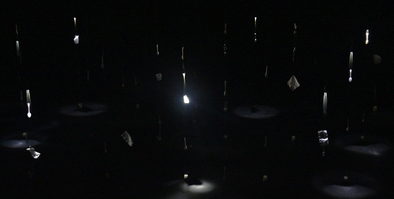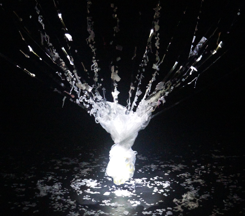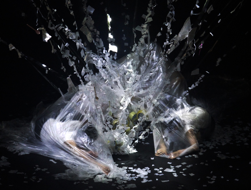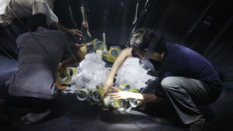 이어서 사람들이 숟가락들을 여기저기 테이프에 다시 달면서 티슈 휴지와 작은 소품도 붙인 후에 사람들이 각자 금속제 통을 들고 나와 소리를 내다가 무대 가운데에서 통을 하나씩 뒤집으니 얇은 습자지 류의 하얀 종이조각들이 쏟아진다. 수북이 쌓인 종이조각 둘레에 투명 테이프들을 대량으로 부착해서 두르고 또 천장에 늘어뜨린 테이프와도 연결시킨다. 그런 다음 종이조각 무더기 둘레에 앉아서들 부채를 부치기 시작하자 종이들이 마구 휘날려 테이프들 여기저기에 마치 포획되는 날벌레들처럼 붙여진다. 무대 뒤켠에 가라앉아 남겨졌던 얇은 그 비닐막을 종이 무더기 옆으로 가져와서 모두들 그 속으로 들어가 바닥을 기어가고 누운 채 종이 무더기 둘레를 회전하며 종이 무더기와 뒤엉키자 투명 테이프들의 아래 부분이 하나로 뭉쳐지고 마침내 전체 모양이 거꾸로 매단 원추 같은 테이프 형상이 눈앞에 나타난다. 그런 후 출연자들은 비닐막 허물을 벗듯이 퇴장하며, 남겨진 거꾸로 매단 원추 형상은 마치 흐드러지게 핀 하얀 쌀꽃처럼 다가온다.