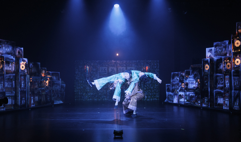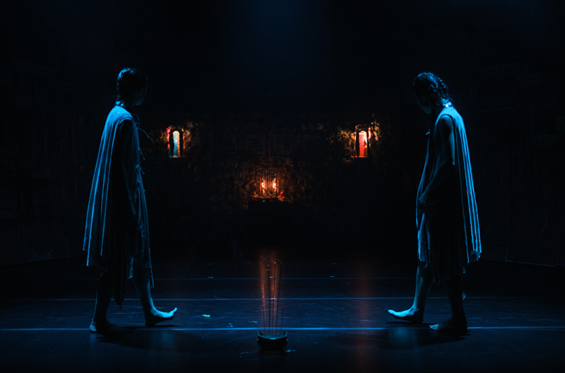 공연장 안으로 들어가면 객석과 가까운 전면에 세 군데의 향로에서 이미 피워놓은 향의 연기로 가득하다. 그리고 그 뒤로 소극장에는 조금은 과분한, 그래서 압도적으로 보이는 축석벽을 재연하여 그 안에 조명기를 넣어 쌓은 높은 무대 장치가 양측에 사선으로 놓여 있고 정면에는 망자의 제단이 차려져 있다. 무대는 장치의 무게를 줄이기 위한 재료 때문인지 ‘리얼’과 ‘키치’ 사이에서 호기심을 불러일으킨다. 물론 우리에게는 불교와 도교와 유교가 섞인 홍콩 특유의 장례 분위기는 이국적이고 흥미롭다.