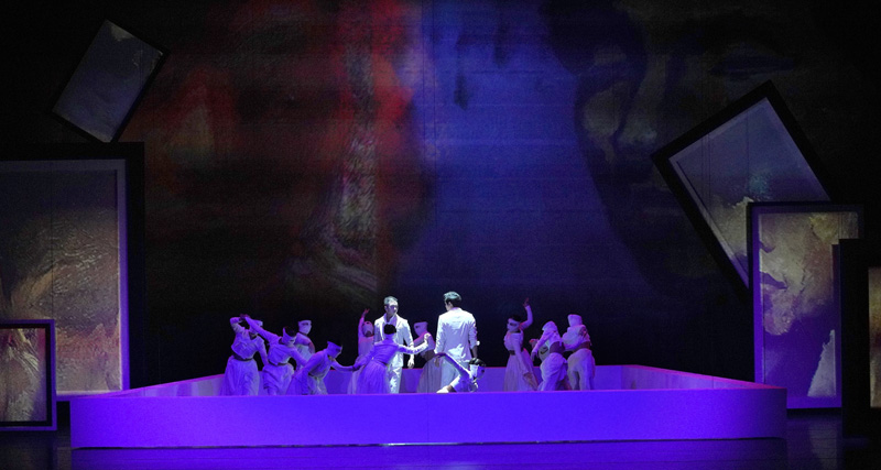 여자가 우산 든 남자의 팔짱을 끼고 같이 돌아선다. 항아리, 소라, 그림, 꽃 소품을 든 다섯 명의 춤. 무대천장에서 사각 프레임이 내려온다. 두 남자로 은유되는 갈등과 전쟁, 분단으로 읽힌다. 총소리와 폭격소리, 작은 프레임속 자화상 등은 마치 현대회화를 보는 듯, 설득력이 있는 그림이다.