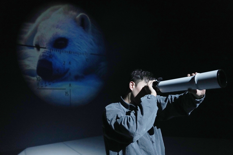 패딩이 벗겨진 캐릭터는 갈색조의 스킨슈트 차림이며 이 캐릭터가 선 상태로 느리게 상체를 일렁이는 동작을 지속할 동안 비디오 카메라맨이 등장하여 그 모습을 라이브로 중계하자 빙하 이미지와 오버랩된다. 그 사이에 바닥에 널브러진 하얀 패딩들을 누군가가 챙겨나간다. 이끼가 덮인 벽면에는 초록색이 비치되 빙판 조각들이 표류하는 동영상이 흘러내리고, 그 캐릭터가 카메라를 가로채어 퇴장하는 것에 때맞추어 하얀 패딩의 무리들이 여남은 명 등장하여 무동 태우기, 줄지어 이동하기 등으로 무리 지은 모습들을 여러 포맷으로 전개한다. 이 무리들의 패딩은 등 부분이 올록볼록하게 처리되었고 다들 펭귄 모양으로 양팔을 까닥이며 종종걸음을 걷는 스타일의 움직임으로 군집을 이룬다. 그 모습이 아둔한 인간 이미지와도 엇비슷한 이 무리들은 망원 렌즈로 사방을 관찰하는데 마침 카메라를 빼앗겨 촬영을 갈구하던 그 카메라맨이 망원 렌즈를 발견해서 촬영 자세를 취하면 무리들은 스스로 그의 촬영 대상으로 나서며 카메라맨과 뒤섞여 어울리고 카메라맨을 찍어주기도 한다. 극지방의 동물들을 암시하는 듯한 이들 무리가 모두 퇴장해도 카메라맨이 망원 렌즈로 촬영을 지속하자 북극곰의 눈알이 무대 정면에 클로즈업되고 그 눈알 속에서 어느 캐릭터의 모습이 라이브로 움직인다.