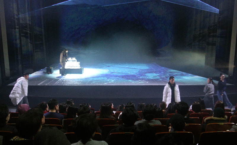 상체만 하얀 패딩을 걸친 집단이 등장하여 카메라맨과 서로 촬영에 몰두하는 도중 무대는 어느덧 붉은 조명으로 물들고 허공에 붉은 레이저빔이 나타난다. 여기에 잔잔하며 빠른 금속성 굉음(이 굉음은 〈멜팅〉의 주제곡인 듯이 여러 차례 길게 들렸다)이 최면제처럼 지속적으로 반복되는 것은 그런 촬영 행동이 중독 증세에 빠졌음을 느끼게 하며 또 그들이 촬영-관광에 몰두하는 사이에 기후위기는 깊어만 간다. 이 대목은 또한 오늘날의 샷 강박 세태도 연상시킨다. 한참 후 무대 정면에서는 빗살이 촘촘히 박힌 금속성 수직 구조물이 모습을 드러내며 대형 고드름 같은 기다랗고 예리한 3각형 물체가 바닥을 향해 천장에 매달리고 물안개가 자욱한 가운데 빙하 같은 그 무엇이 내려앉는 듯한 쿵쿵 소리가 울리며 빙하가 녹아 흐르는 물소리도 들린다.