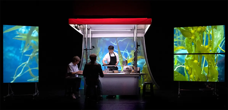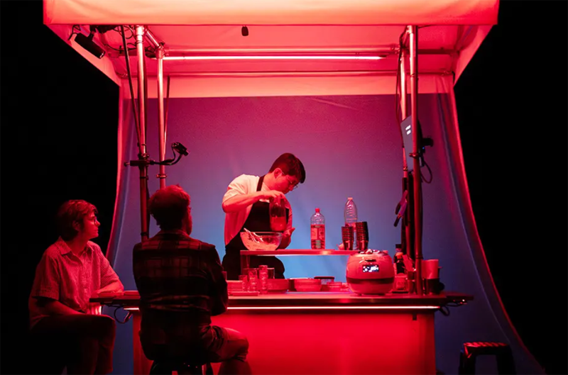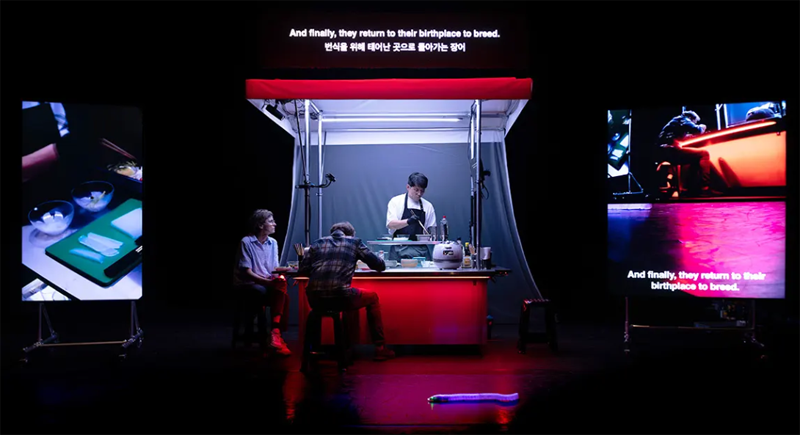 먼저 〈하리보 김치〉라는 작품 이름에서 드러나듯, 구자하는 다른 문화가 교차하고 부딪히는 과정을 음식을 주제로 펼쳐낸다. 작품 속에 달팽이, 하리보 젤리, 장어는 상징적 화자로 등장하는데, 연관성이 없어보이는 세 개의 객체는 구자하 자신을 투영하는 대상이 된다. 무대는 서울의 야경이 빨간 텐트 위에 투사되면서 시작된다. 심야 고층 빌딩과 환한 불빛, 대로변과 여흥가를 지나 빨간색 포장마차가 등장하는데 이내 무대 위에는 실제 포장마차가 등장한다. 구자하가 앞치마를 입은 퍼포머로 등장해 장사를 시작한다. 그는 관객 두 명을 손님으로 모시는데 “우연히도” 외국인 여성 두 명이 무대 위로 오른다. 포장마차 손님이 된 이들에게 마실 것을 먼저 제안하고 음식 알러지 유무를 확인한 후 어떤 코스 요리가 제공되는지 설명해준다. 관객과 한참 대화를 이어가던 구자하는 관객석을 향해 첫 번째 주제인 달팽이에 관한 에피소드를 이야기하기 시작한다. (마치 아이폰과 갤럭시의 폴더 화면을 연상시키는 듯한) 양옆의 모니터에는 그가 핸드폰으로 찍은 영상과 애니메이션, 구자하 목소리의 내레이션이 흘러나온다.