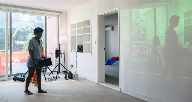 슬레이트를 통해 매 장면의 시작과 끝이 결정된다. 페루 출신 퍼포머(Maricarmen Gutierrez)는 단역으로 참여한 관객을 커뮤니티 일원으로 초대하는 듯 하나 결국에는 모두의 참여와 의견 토론을 통한 동의 없이는 결정이 불가능하고 세부 규정을 알려 줄 수 없다고 말한다. 결국 정체를 알수 없는 이데올로기적 시스템에 의해 커뮤니티로의 진입은 이방인에게 허락되지 않는다. 작품은 형식적 포용과 실질적 배제의 현실을 보여준다. 그러한 현실은 유령같은 존재이자 지각되지 않는 언어를 가진 불청객의 존재론적 상태를 통해 현현된다. 얼굴을 거의 가린 가발을 쓴 퍼포머(임지애 무용가)는 유령처럼 관객 사이를 지나서 세트장에 입장하고 촬영이 시작된다. 2층에서 보츠와나 출신 퍼포머(Mmakgosi Kgabi)는 창문 밖으로 나가고 다시 들어오고 ‘문지방’에 서서 발화한다. 불면의 밤들 가운데 길 잃은 언어들, 흐릿한 언어들이 흩어지고 그들은 몽유병처럼 유령처럼 사라진다.