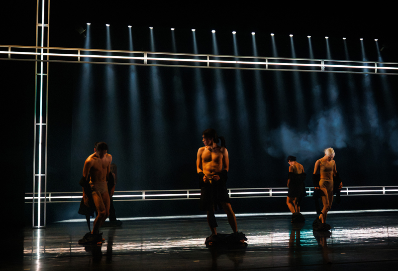 시간 즉 만남이 돌변하는 후반부는 시작 지점에서부터 빠른 테크노 리듬을 배경으로 하고 기다란 엘이디 조명바들이 대형의 사각형 구조물로 설치되었다. 현대의 도시 문화를 연상시키는 분위기 속에서 검정옷을 입은 사람들의 일체화된 움직임들은 급하고 에너지가 강하며 공세적인 느낌을 유발한다. 한참 지속되는 이런 순간들에 이어 사람들은 실신하며 배회하고 저마다 겉옷을 벗고 물러난다. 다시 착의해서 등장하지만 배회하며 방황하는 기색이 여전한 분위기에서 모두들 물러간다. 여기서 탈의는 습성화된 부정적인 시간, 다시 말해 자기 상실의 상황을 벗어나려는 몸짓을 시사할 테지만 다시 착의하는 데서는 그러한 시도가 여의치 않다는 것이 암시된다. 이어 등장하는 남녀들은 망사 같은 천을 두르고 있어서 송풍기 바람에 옷자락이 줄곧 흩날리는 장면이 쏟아지는 조명 아래 오래 연출된다. 대체로 후반부에서는 질적으로 퇴행하는 현대의 시간이 묘사되고 그런 시간에 선뜻 순응하지 않는 인간의 의지가 표출된다.