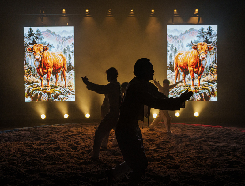 모든컴퍼니의 〈씨름〉(2025.12.26.-27. 메리홀대극장)은 또 다르게 씨름이라는 주제를 조망하고 있었다. 김홍도의 씨름 민속화를 LED 화면에 띄운 것에서 시작하여 『난중일기의 씨름의 의미와 재해석』(공성배‧이태현 공저, 2024, 대한무도학회지)과 『식민지 시기 ‘전통’놀이 씨름의 근대화 과정과 특징』(임동현, 2024, 한국독립운동사연구) 등을 참고하여 역사적인 조망을 한 것은 말할 것도 없이 EBS 역사채널e 〈씨름〉에서 빌려온 피바다가극단의 씨름춤과 1983년 문화영화 〈씨름〉의 장면들을 보여주며 공연 공간을 마치 씨름 박물관처럼 꼼꼼한 고찰의 공간으로 만든다.